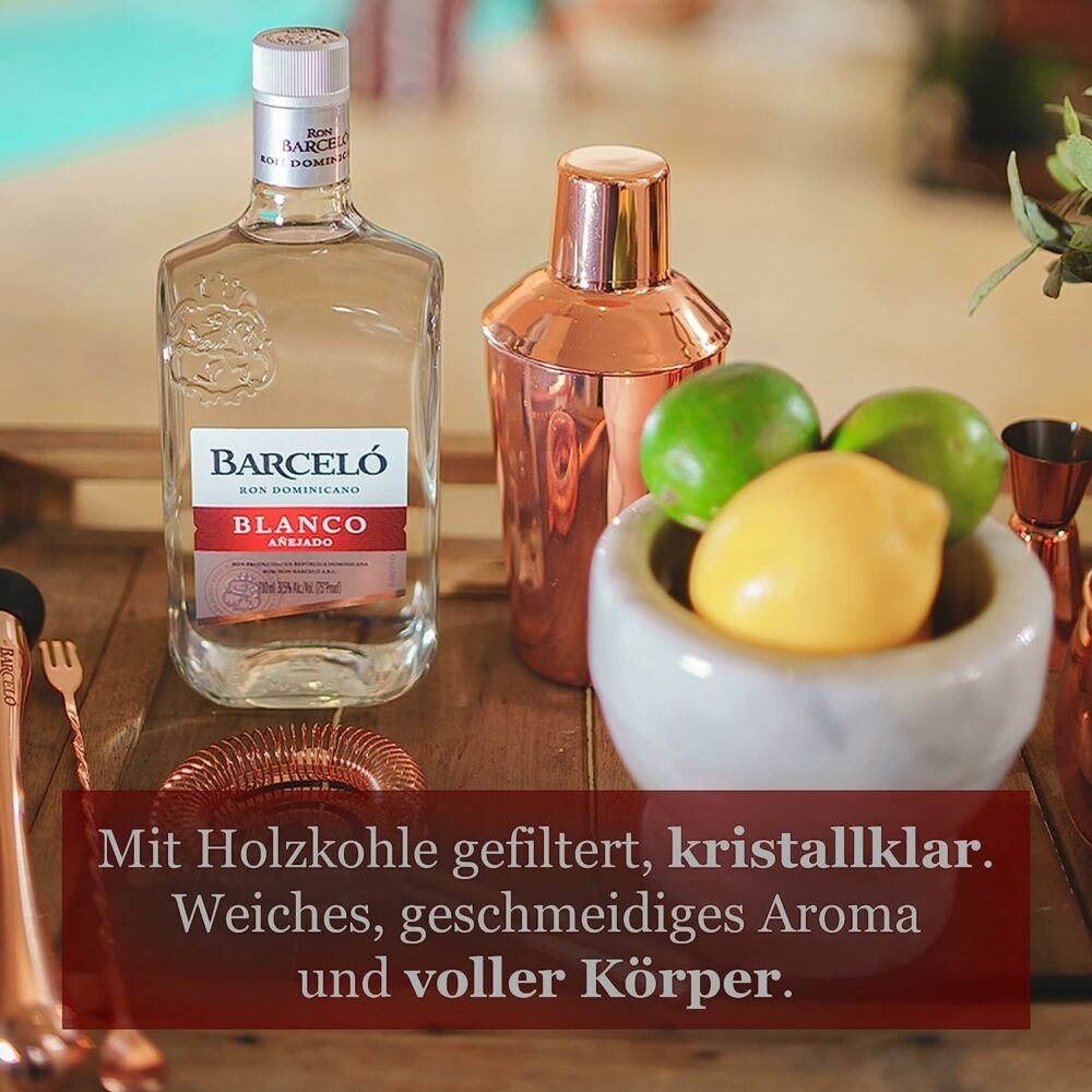 A Barceló Blanco egy kiváló minőségű dominikai fehér rum, amely a helyi cukornád frissen préselt levéből készül. Akár két évig érlelik tölgyfahordókban, hogy gazdagabb és komplexebb ízvilágot kapjon, majd gondos faszénszűrésen esik át, hogy elnyerje kristálytiszta színét. Az illatában a zöld banán frissessége keveredik a fehér bors enyhe fűszerességével. Ízében az édes zöld banán dominál, amelyet fahéjas és rózsaborsos árnyalatok egészítenek ki. Lágy és kiegyensúlyozott karaktere miatt ideális alapanyag koktélokhoz, például mojitóhoz vagy daiquiríhez, de önmagában is remek választás. A Barceló márka a dominikai rumgyártás egyik ikonikus képviselője, amely több mint 90 éve készít kiváló minőségű rumokat.